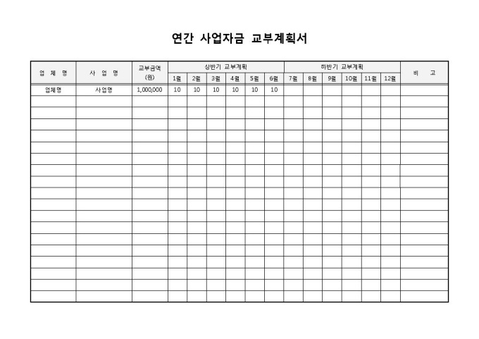 9,000원/월연간 사업자금 교부계획서입니다. 업체명, 사업명, 교부금액, 상반기 교부계획, 하반기 교부계획 등으로 구성되어 있습니다. 기업에서 연간으로 사업자금에 대한 교부계획서를 작성할 때 사용할 수 있습니다.