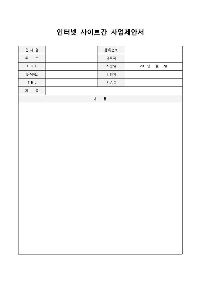 9,000원/월인터넷 사이트간 사업제안서입니다. 업체명, 등록번호, 주소, 대표자 등으로 구성되어 있습니다. 거래처와 인터넷 사이트간 사업에 대한 제안서를 작성할 때 사용할 수 있습니다.