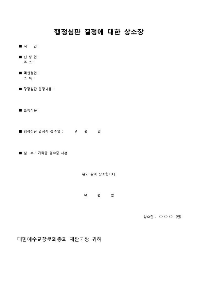 9,000원/월행정심판 결정에 대한 상소장입니다. 사건, 신청인, 피신청인, 행정심판 결정내용, 불복사유, 행정심판 접수일, 첨부 등으로 구성되어 있습니다. 행정심판에 의한 결정에 대해 항소장을 제출할 때 작성하여 사용할 수 있습니다.