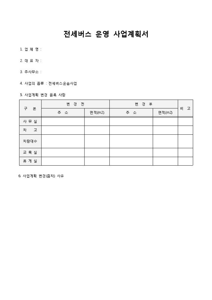 9,000원/월전세버스 운영 사업계획서입니다. 업체명, 대표자, 주사무소, 사업의 종류, 사업계획 변경 등록 사항 등으로 구성되어 있습니다. 기업에서 전세버스에 대한 운영 계획서로 작성하여 사용할 수 있습니다.