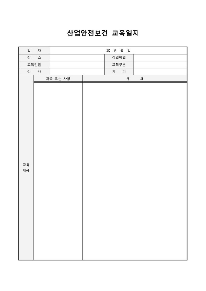 9,000원/월산업안전보건 교육일지입니다. 일자, 장소, 강의방법, 교육인원, 교육구분, 강사 등으로 구성되어 있습니다. 회사에서 산업안전에 대해서 직원에게 교육하고 일지로 작성하여 사용할 수 있습니다.