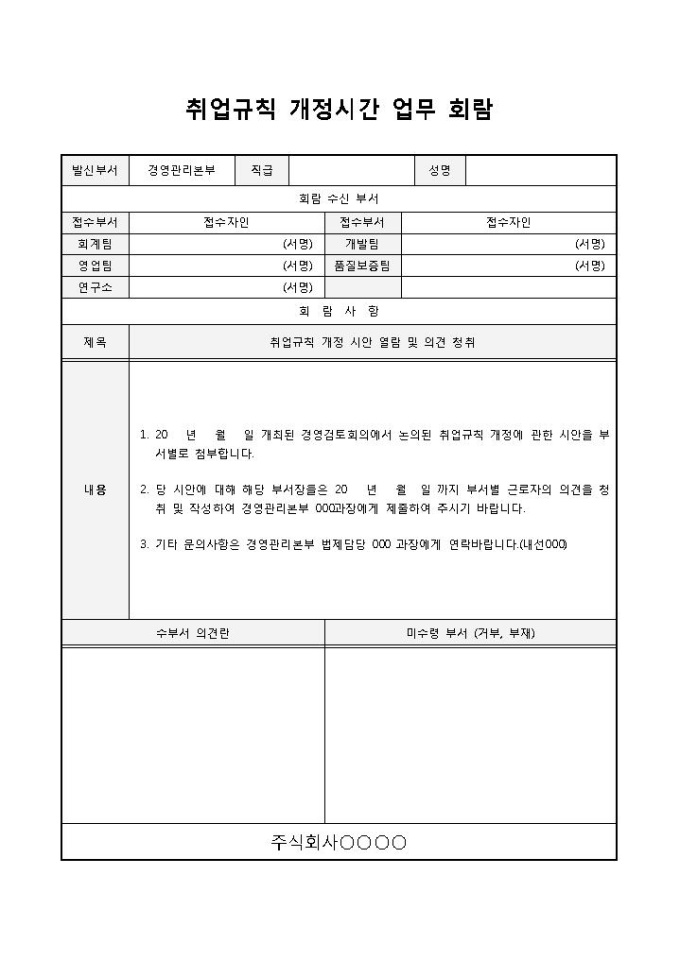 9,000원/월취업규칙 개정시간 업무 회람입니다. 발신부서, 직급, 성명, 접수부서, 제목, 내용 등으로 구성되어 있습니다. 회사내의 취업규칙과 개정시간, 업무에 대한 회람으로 작성하여 사용할 수 있습니다.