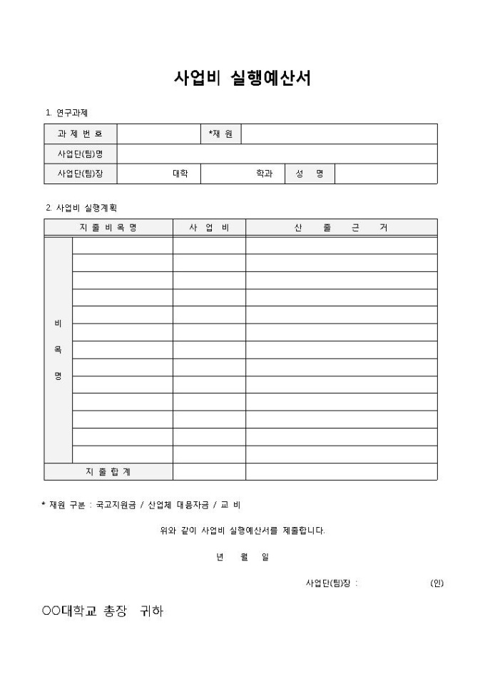 사업비 실행예산서입니다. 연구과제, 사업비 실행계획 등으로 구성되어 있습니다. 사업 실행에 대한 예산을 보고할 때 사용할 수 있습니다.
