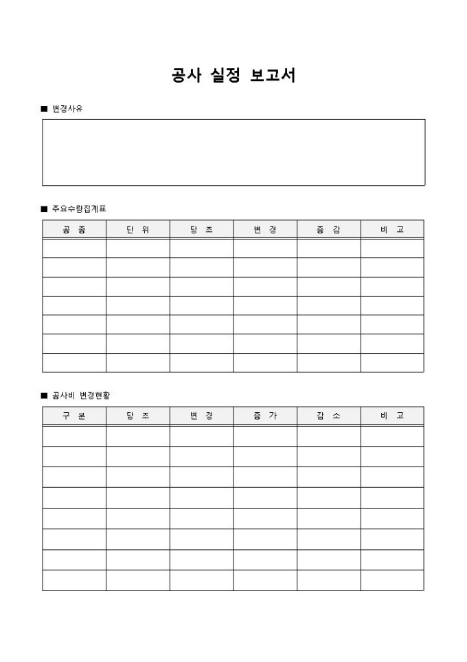 공사 실정 보고서입니다. 변경사유, 주요 수량 집계표, 공사비 변경현황 등으로 구성되어 있습니다. 공사 실정에 대한 보고를 할 때 사용할 수 있습니다.