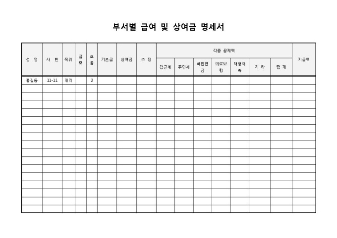 9,000원/월부서별 급여 및 상여금 명세서입니다. 성명, 사번, 직위, 급호, 호봉, 기본급, 상여금 등으로 구성되어 있습니다. 부서별로 구분할 수 있으며, 상여금에 대한 명세서로 작성하여 사용할 수 있습니다.