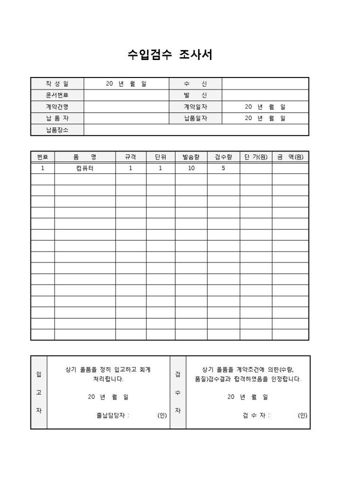 9,000원/월수입검수 조사서입니다. 작성일, 문서번호, 수신, 발신, 계약건명, 계약일자 등으로 구성되어 있습니다. 기업이 수입에 대한 검수와 조사서를 작성할 때 사용할 수 있습니다.