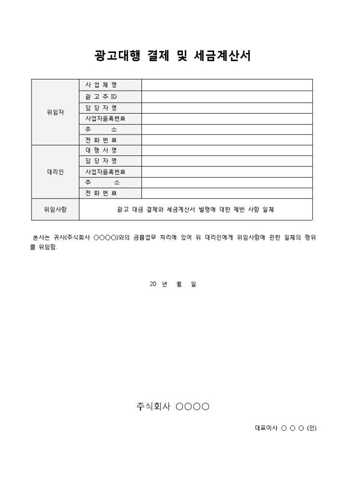 광고대행 결제 및 세금계산서입니다. 위임자 인적사항, 대리인 인적사항 등으로 구성되어 있습니다. 기업간의 광고대행과 이에 대한 세금을 계산할 때 작성하여 사용할 수 있습니다.