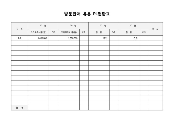 9,000원/월방문판매 유통 PL현황표입니다. 구분, 매년 초기 투자 비용 등으로 구성되어 있습니다. 기업에서 방문판매로 인한 유통 PL를 조사할 때 사용할 수 있습니다.