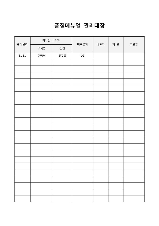 품질메뉴얼 관리대장입니다. 관리번호, 매뉴얼 소유자, 배포일자, 배포자, 확인 등으로 구성되어 있습니다. 기업에서 품질에 대한 매뉴얼을 관리할 때 작성하여 사용할 수 있습니다.