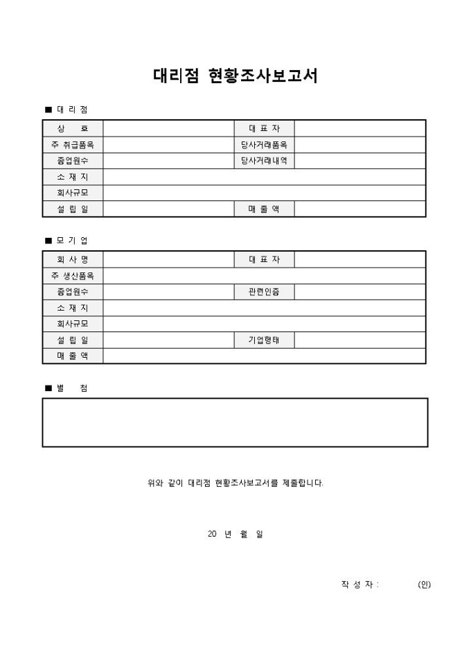 9,000원/월대리점 현황조사보고서입니다. 대리점, 모기업, 별첨 등으로 구성되어 있습니다. 기업에서 당사의 대리점을 조사하고 이에 대한 현황을 보고할 때 작성하여 사용할 수 있습니다.