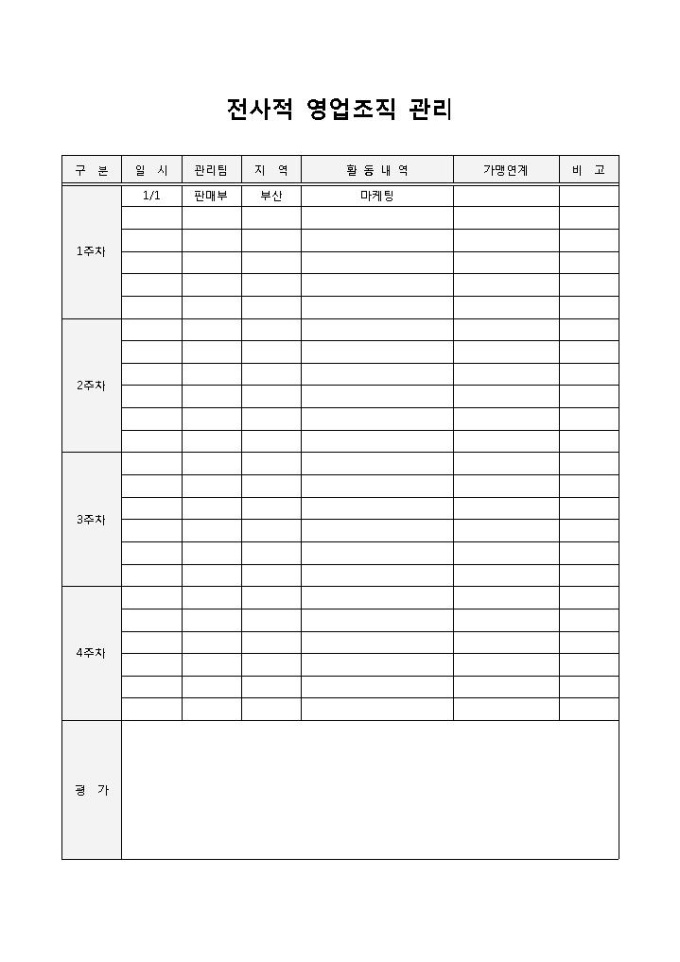 전사적 영업조직 관리입니다. 구분, 일시, 관리팀, 지역, 활동내역, 가맹연계 등으로 구성되어 있습니다. 1주차, 2주차 등으로 항목을 작성할 수 있어 주를 비교해 가며 사용할 수 있습니다.