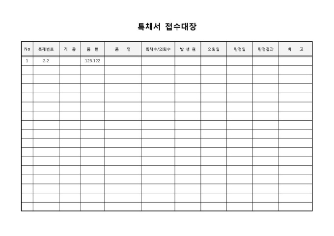9,000원/월특채서 접수대장입니다. 특채번호, 기종, 품번, 품명, 특채수, 발생원, 의뢰일, 판정일 등으로 구성되어 있습니다. 특채서류에 대한 접수를 기록하고 판정일과 판정결과까지 작성하여 사용할 수 있습니다.