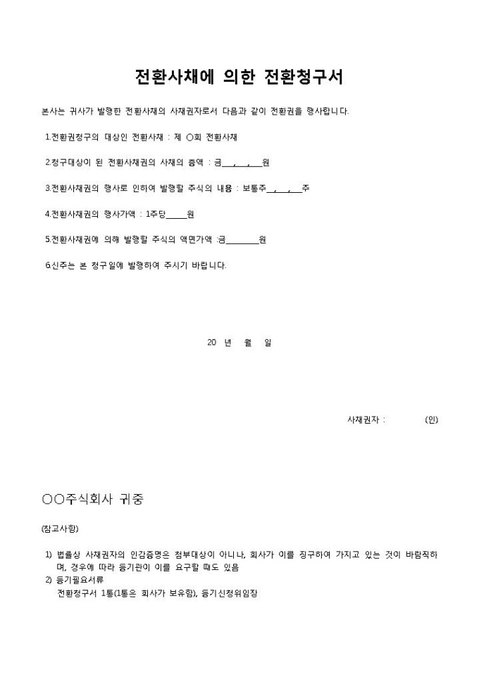 9,000원/월전환사채에 의한 전환청구서입니다. 전환청구서 내용으로 구성되어 있습니다. 기업에서 사채권에 대한 전환권을 행사할 때 작성하여 사용할 수 있습니다.
