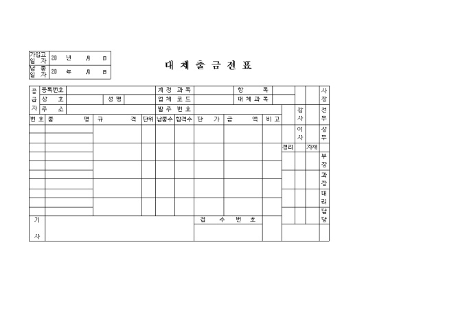 9,000원/월결재란이 있고 품명, 규격, 납품수, 합격수 등을 기재하는 대체출금전표 양식입니다.