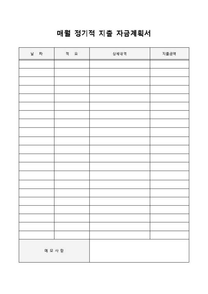 매월 정기적 지출 자금계획서입니다. 날짜, 적요, 상세내역, 지출금액으로 구성되어 있습니다. 개인이나 사업장에서 매월마다 정기적으로 지출되는 자금에 대한 계획을 세울 때 사용할 수 있습니다.