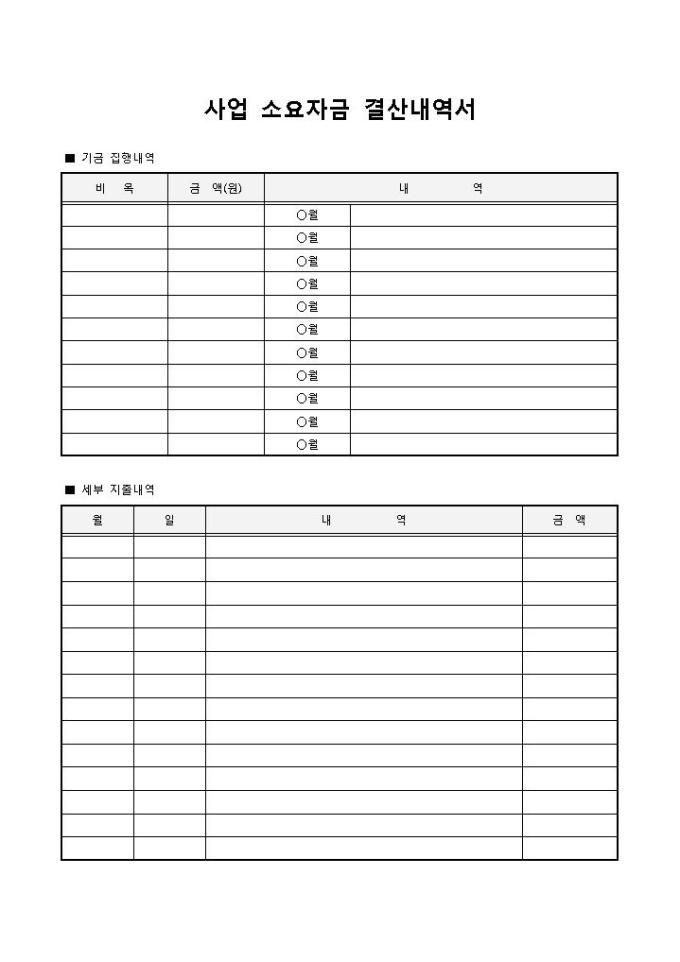 9,000원/월사업 소요자금 결산내역서입니다. 기금 집행내역, 비목, 금액, 내역, 세부 지출내역, 금액 등으로 구성되어 있습니다. 사업장에 사용할 수 있으며, 사업에 대한 소요자금을 결산하고 이를 내역서로 작성할 때 사용할 수 있습니다.