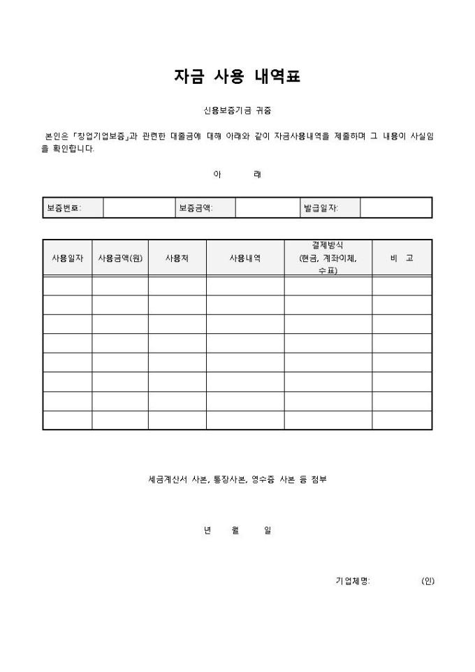9,000원/월자금사용 내역표입니다. 보증번호, 보증금액, 발급일자, 사용일자, 사용금액, 사용처 등으로 구성되어 있습니다. 자금에 대한 사용 내역을 기록할 때 사용할 수 있습니다.