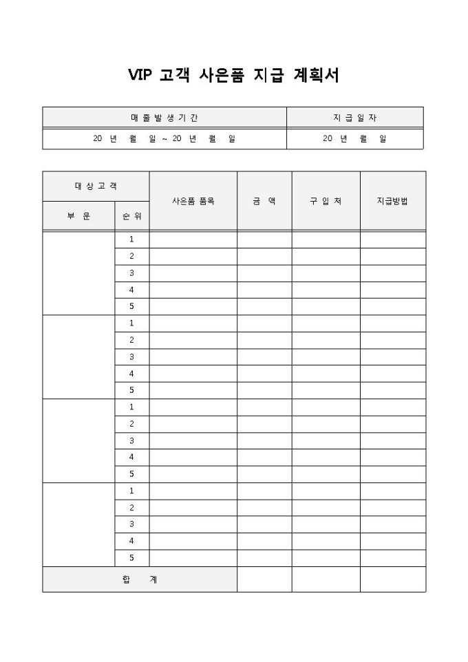 9,000원/월VIP고객 사은품 지급계획서입니다. 매출발생기간, 지급일자, 대상고객, 사은품 품목, 금액, 구입처, 지급방법 등으로 구성되어 있습니다. VIP고객을 상대로 사은품을 지급하고 계획을 작성할 때 사용할 수 있습니다.