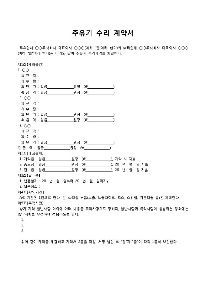 9,000원/월주유기 수리 계약서입니다. 주유기 수리 계약 내용으로 구성되어 있습니다. 주유기의 수리를 계약할 때 사용할 수 있습니다.