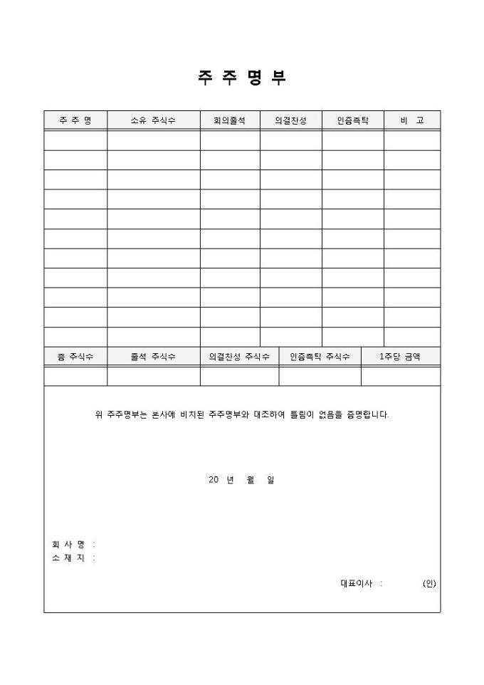 9,000원/월주주명부입니다. 주주명, 소유 주식수, 회의출석, 의결찬성, 인증촉탁, 비고 등으로 구성되어 있습니다. 주주를 명부에 기록할 때 사용할 수 있습니다.