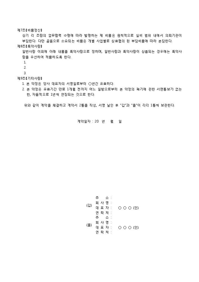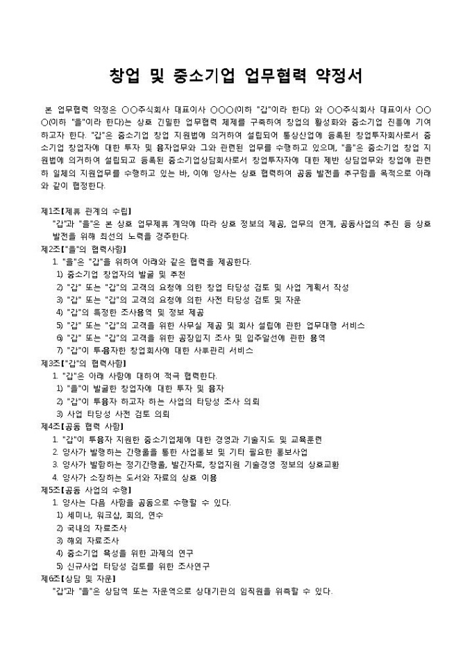 9,000원/월창업 및 중소기업 업무협력 약정서입니다. 업무협력 약정 내용으로 구성되어 있습니다. 창업이나 중소기업의 업무에 대한 협력을 약정할 때 사용할 수 있습니다.