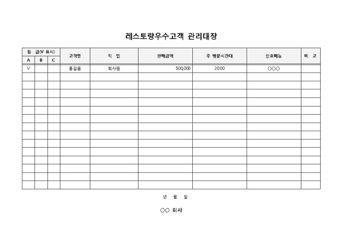 레스토랑의 우수고객에 대한 등급, 선호메뉴, 판매금액을 고려하여 관리 및 기록할 때 사용되는 레스토랑 우수고객 관리대장 양식입니다. 등급(A~C), 고객명, 직업, 판매금액, 주 방문시간대, 선호메뉴 등의 항목으로 구성되어 있습니다.