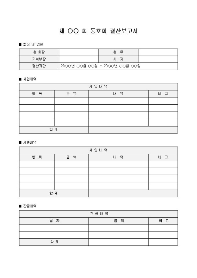 동호회 결산보고서입니다. 동호회 결산보고서에 대한 내용을 작성하는 문서로 회장 및 임원, 세입내역(항목, 금액, 내역 비고), 세출내역, 잔금내역 등으로 구성되어 있습니다.