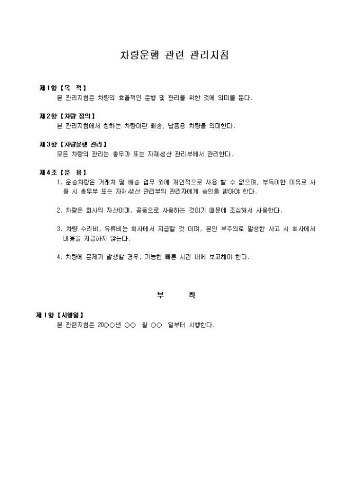 9,000원/월차량운행 관리지침입니다. 차량운행의 관리에 대한 지침서로 목적, 차량정의, 차량운행 관리, 운용 등으로 구성되어 있습니다.