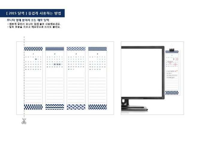 2015년 디자인달력(모니터부착형)입니다. 유럽풍 패턴이 돋보이는 세련된 디자인과 메모할 수 있는 공간으로 구성되어 있습니다. 모니터 옆에 부착하여 개인업무, 일정관리 등을 효과적으로 관리할 수 있습니다. 디자인달력 활용법 가이드가 첨부되어 있습니다. 디자인달력 활용법 가이드가 첨부되어 있습니다.
