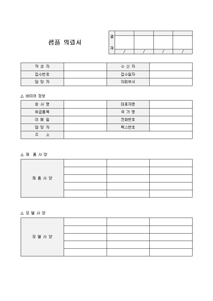 9,000원/월샘플 의뢰서입니다. 샘플을 의뢰하기 위하여 타기업에 보내는 의뢰서로 바이어 정보(회사명, 대표자명, 담당자), 제품사양, 모델사양 등으로 구성되어 있습니다.