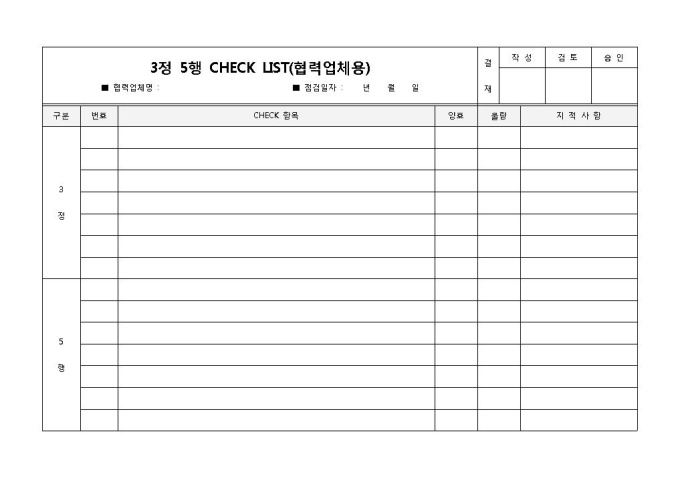 3정5행 체크 리스트입니다. 3정과 5행으로 구분되어 있고, 체크, 양호, 불량 등의 항목으로 구성되어 있습니다. 현장용으로나 사무실용으로 많이 사용됩니다.