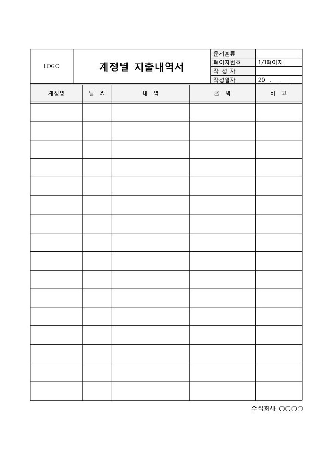 계정별로 일정기간 동안 사용한 경비지출의 내용을 기록할 때 사용되는 각 계정별 지출내역서입니다. 계정명, 날짜, 내역, 금액 등의 항목으로 구성되어 있습니다.
