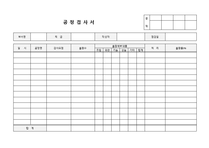 검사서 입니다. 부서명, 일시, 공정명, 검사요점 등으로 구성되었으며, 세부내용 파악에도 용이한 양식입니다.