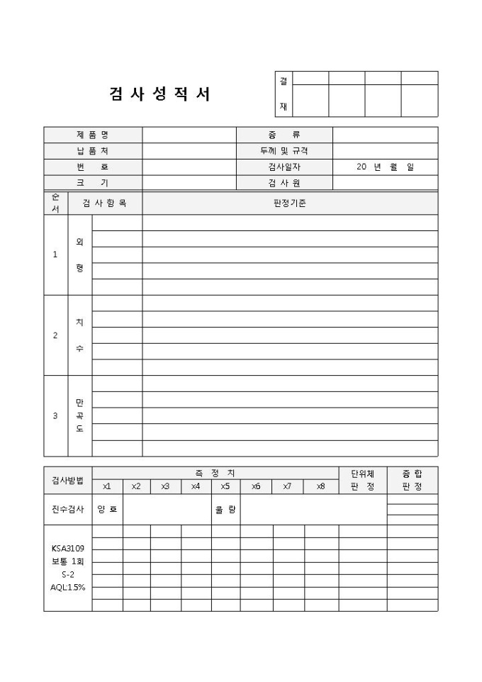 9,000원/월검사성적서(제품)입니다. 외형, 치수, 만곡도, 검사방법, 판정, 시중에 유통될 제품의 특징을 검사하고 그것에 대하여 평가하고자 만들어진 서식입니다.