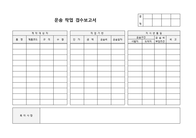 9,000원/월운송작업 검수보고서 입니다. 계약대상자, 작업기한, 지시년월일 등으로 구성되었습니다. 특이사항 기입에도 용이한 양식입니다.