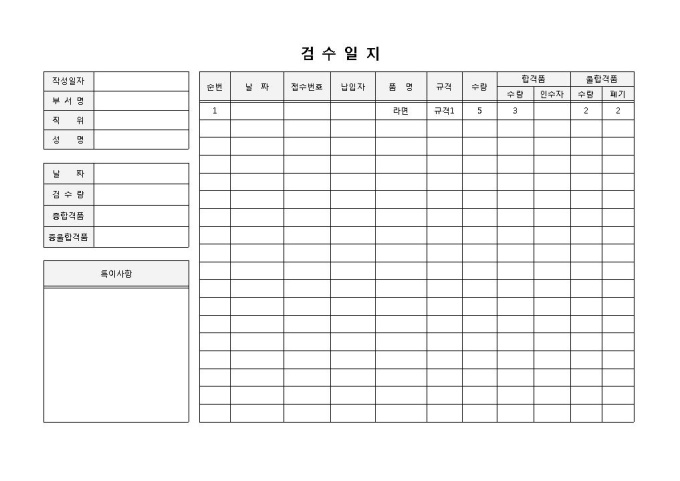 검수일지 입니다. 작성일자, 부서명, 직위, 성명, 날짜, 검수량 등으로 구성되었습니다. 세부적인 내용까지 기입할 수 있는 양식입니다.