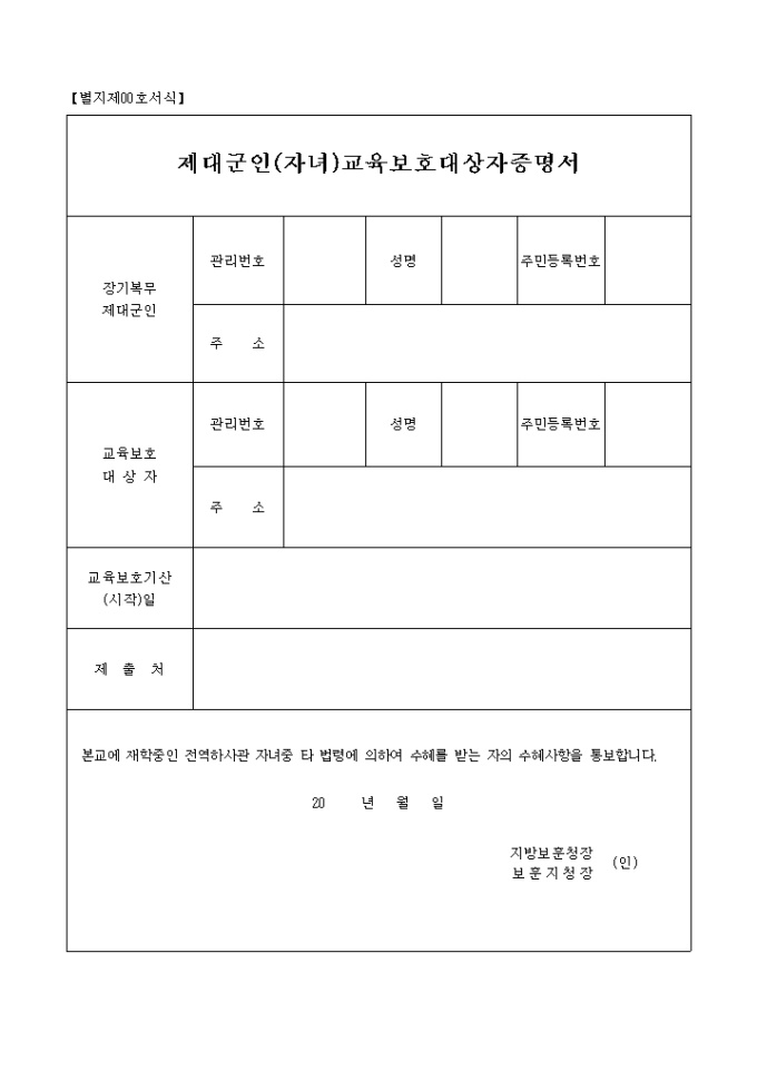 본교에 재학중인 전역하사관 자녀중 타 법령에 의하여 수혜를 받는 자의 수혜사항을 통보할 때 쓰이는 증명서 양식입니다.