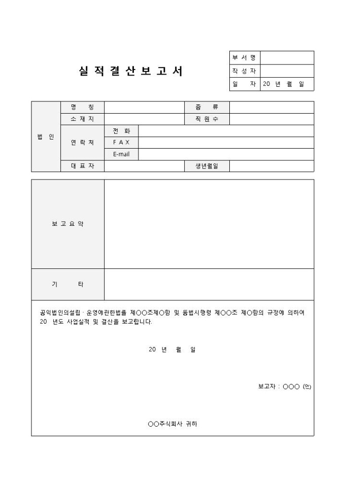 9,000원/월실적 결산보고서 입니다. 법인, 명칭, 소재지, 종류, 직원수, 주민등록번호 등으로 구성되었습니다. 보고요약을 통해 보다 구체적인 사항까지 기입할 수 있습니다.