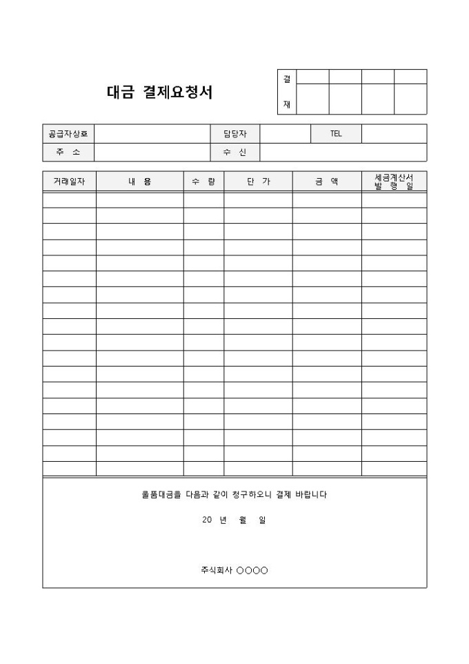 9,000원/월대금결제요청서 입니다. 공급자상호, 담당자, TEL, 거래일자, 내용 등으로 구성되었으며, 금액 기입에 용이합니다.