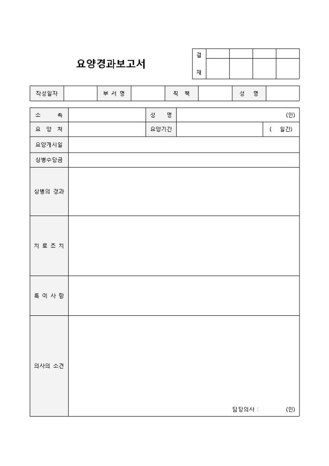 요양 경과보고서 입니다. 소속, 성명, 요양처, 요양기간, 요양개시일 등으로 구성되었습니다. 치료상황 및 의사소견을 보다 명확히 기입할 수 있습니다.