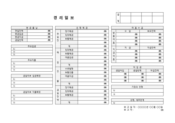 9,000원/월경리일보 입니다. 현급출납, 은행예금, 어음수급 등으로 구성되었으며, 업무파악 및 보고에 용이한 양식입니다.