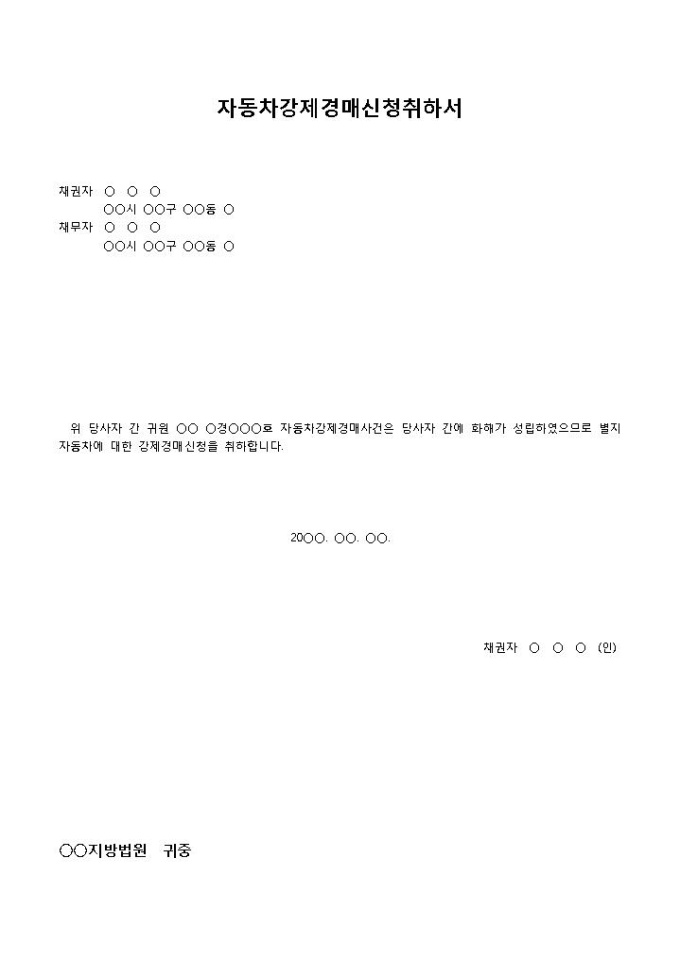 9,000원/월경매취하서(자동차강제경매)입니다. 채권자의 정보, 채무자의 정보 등의 항목으로 구성되어 있습니다. 자동차 강제 경매 건에 대해 당사자 간의 합의로 강제경매 신청을 취하한다는 내용의 경매취하서 양식입니다.
