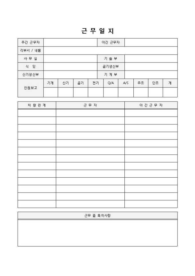 9,000원/월경비근무일지 입니다. 주간근무자, 야간근무자, 인원보고, 특이사항 등으로 구성된 양식입니다.