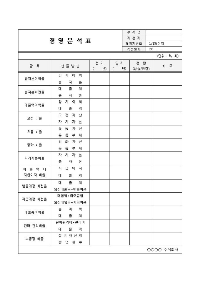 경영 성과를 분석한 결과를 기록할 때 사용되는 경영 분석표 양식입니다. 해당 항목별로 산출방법과 전기, 당기, 경향의 상승 및 하강 등의 항목으로 구성되어 있습니다. 경영의 분석을 보다 쉽게 할 수 있습니다.