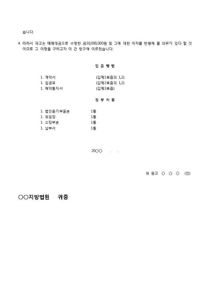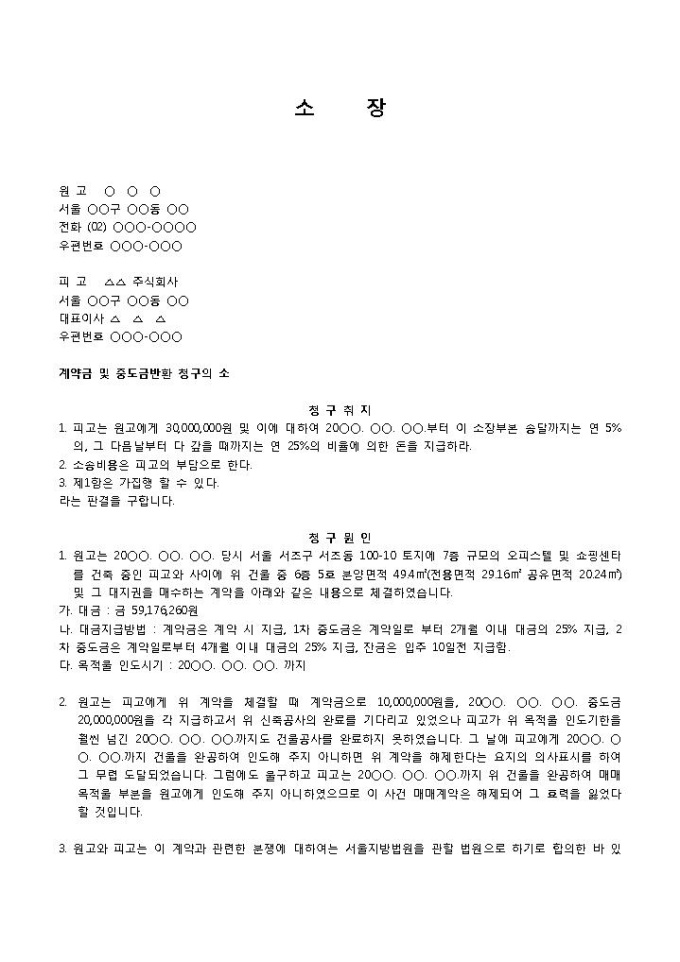 9,000원/월계약금반환청구소송(계약효력소멸)입니다. 건축공사 계약 후 건축이 완료되지 않아 계약효력이 소멸함을 이유로 공사 계약금 반환을 청구하는 소장 양식입니다.