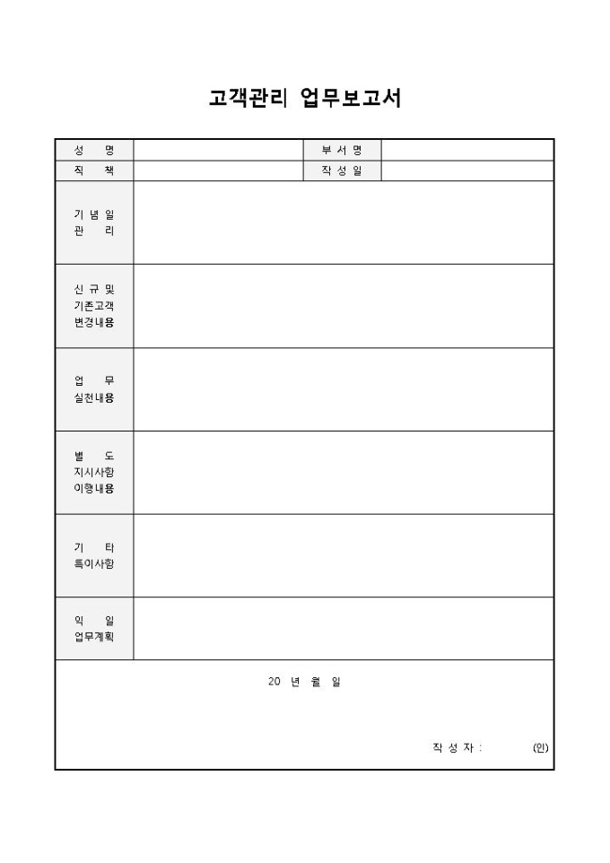 고객관리 업무보고서입니다. 성명, 부서명, 직책, 작성일, 기념일 관리, 신규 및 기존고객 변경 내용 등으로 구성되어 있습니다. 기업에서 고객에 관한 관리와 이에 대한 업무 보고서로 작성하여 사용할 수 있습니다.