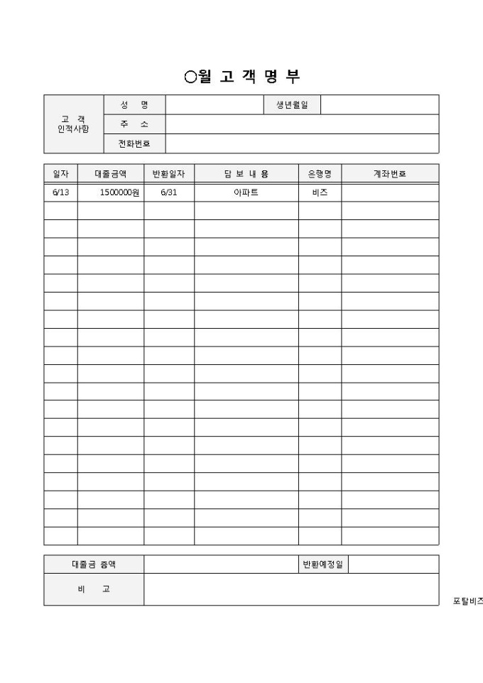 9,000원/월고객대출명부 입니다. 고객인적사항, 대출일자, 대출금액, 담보내용 등으로 구성 되었으며, 최종 대출금 합계 및 반환예정일 계산에도 용이한 양식입니다.