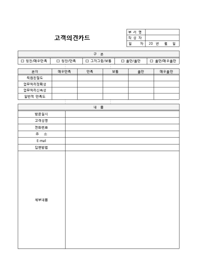 9,000원/월고객의견카드 입니다. 구분, 분야, 내용 등으로 구성되었으며, 세부내용을 통해 체크란에서 기입하지 못한 불만 및 건의, 칭찬사항을 구체적으로 서술 할 수 있습니다.