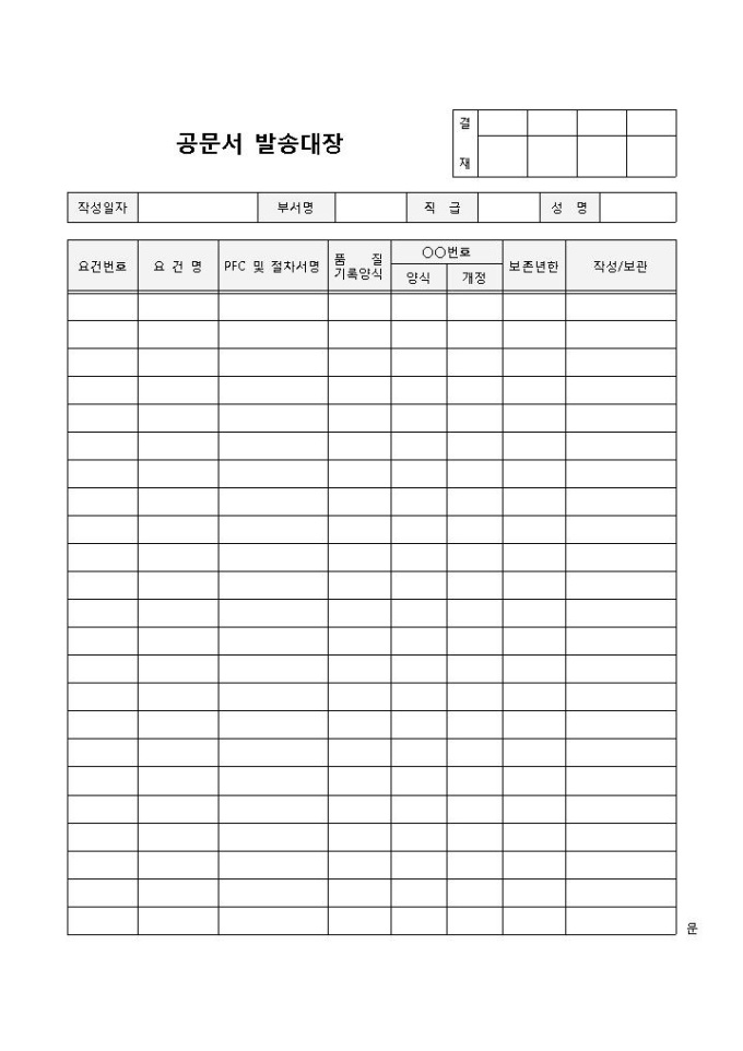 9,000원/월공문서발송대장 입니다. 작성일자, 부서명, 직급, 성명, 요건번호, 품질기록양식, 양식, 개정, 보존년한, 작성/보관 등으로 구성되었으며, 발송 및 보관 점검에 용이합니다.
