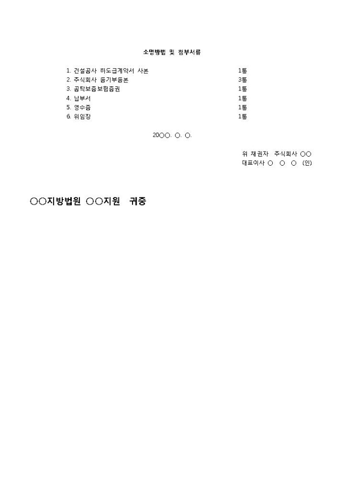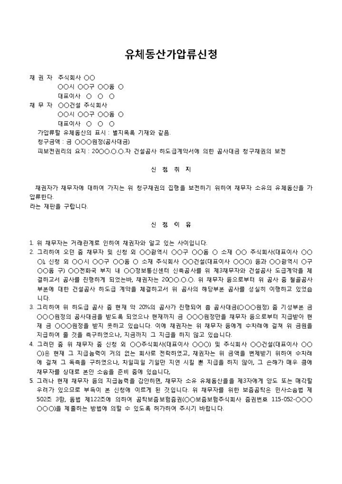 9,000원/월공사대금가압류신청서(유체동산)입니다. 채권자, 채무자의 인적사항 등의 항목으로 구성되어 있습니다. 공사대금 미수급시 채무자의 유체동산에 대해 가압류를 신청할 수 있는 신청서 양식입니다.